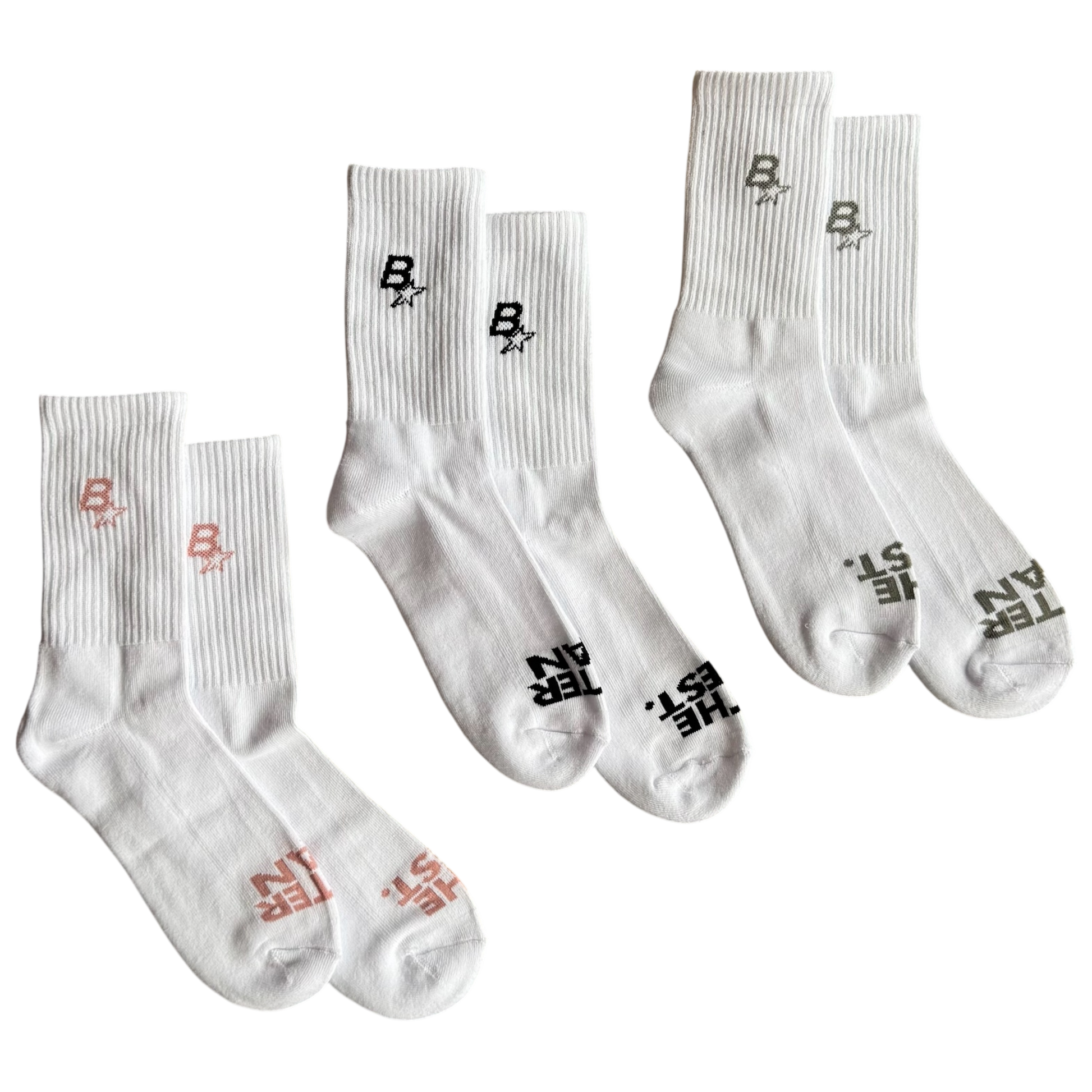 BEST® socks with BSTAR print on the ankle & "BETTER THAN THE REST" jacquard print on the toes in white/black, white/pink & white/grey